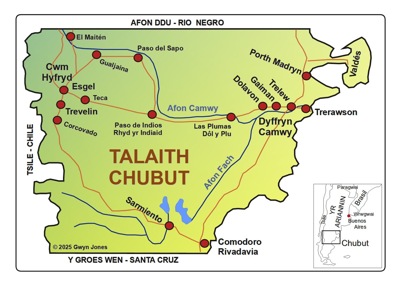 Sefydlwyd Porth Madryn yn y Bae Newydd gan y gwladfawyr; Rawson, Gaiman, Trelew a Dolavon yn y dyffryn; a Trevelin ac Esquel yn yr Andes. Mae llawer o’u disgynyddion hefyd yn byw Comodoro Rivadavia (tref fwyaf y dalaith); yn Colonia Sarmiento – a llawer o daleithiau eraill ledled yr Ariannin. Gwnaethant greu cymunedau Cymreig ffyniannus, lle’r oedd y Gymraeg yn amlwg; mewn cydweithrediad â Llywodraeth yr Ariannin, gan gyd-fyw’n heddychlon â’r brodorion – yr unig enghraifft o wladychu di-drais yn hanes cyfandir America.